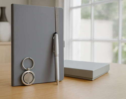 Premium 3-in-1 Business Gift Set with Grey Notebook, Pen & Keychain – Elegant A5 Size| Code: CON-Med-Col-08