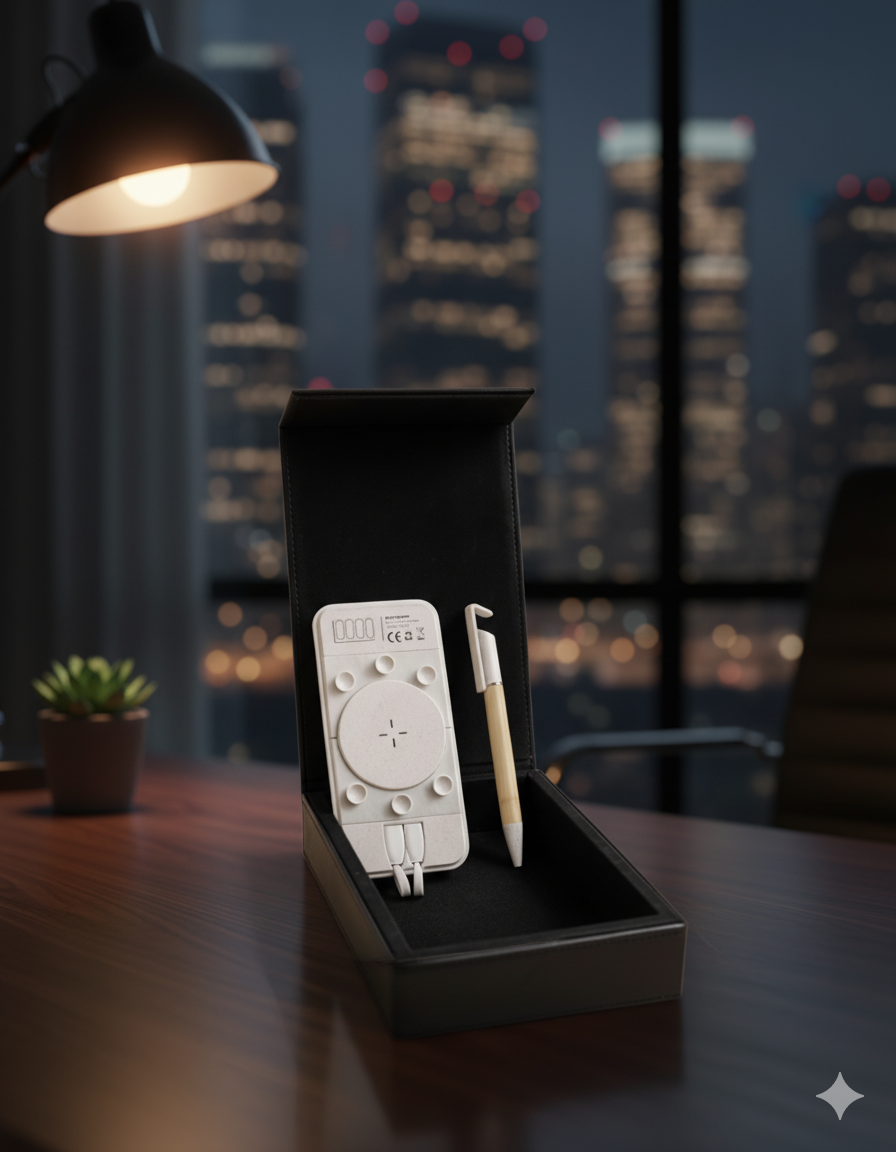 It includes a compact power bank and a stylish pen, both crafted from durable wheat straw material — known for being lightweight, biodegradable, and environmentally friendly.