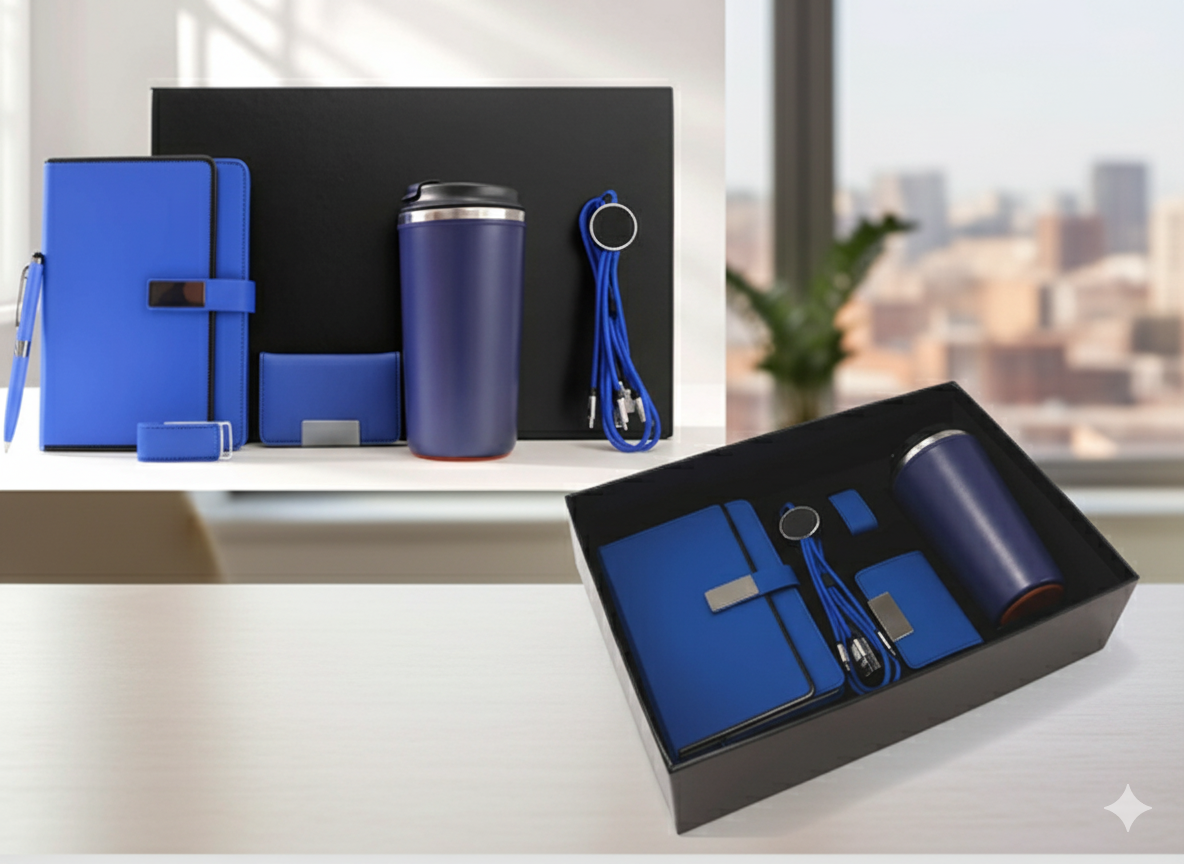 Executive Business Gift Set with Notebook, Thermal Mug, Flash Drive, Metal Pen, Card Holder & Charging Cable – Navy Blue| Code:CON-Business-Blue-1