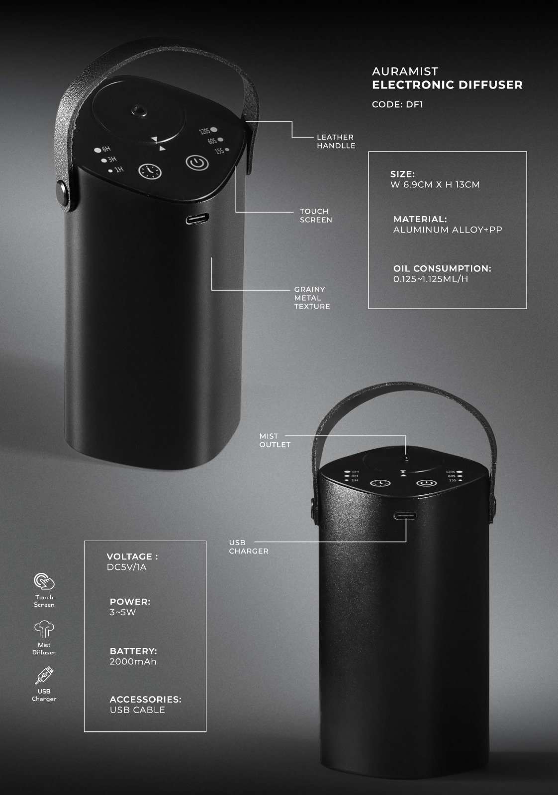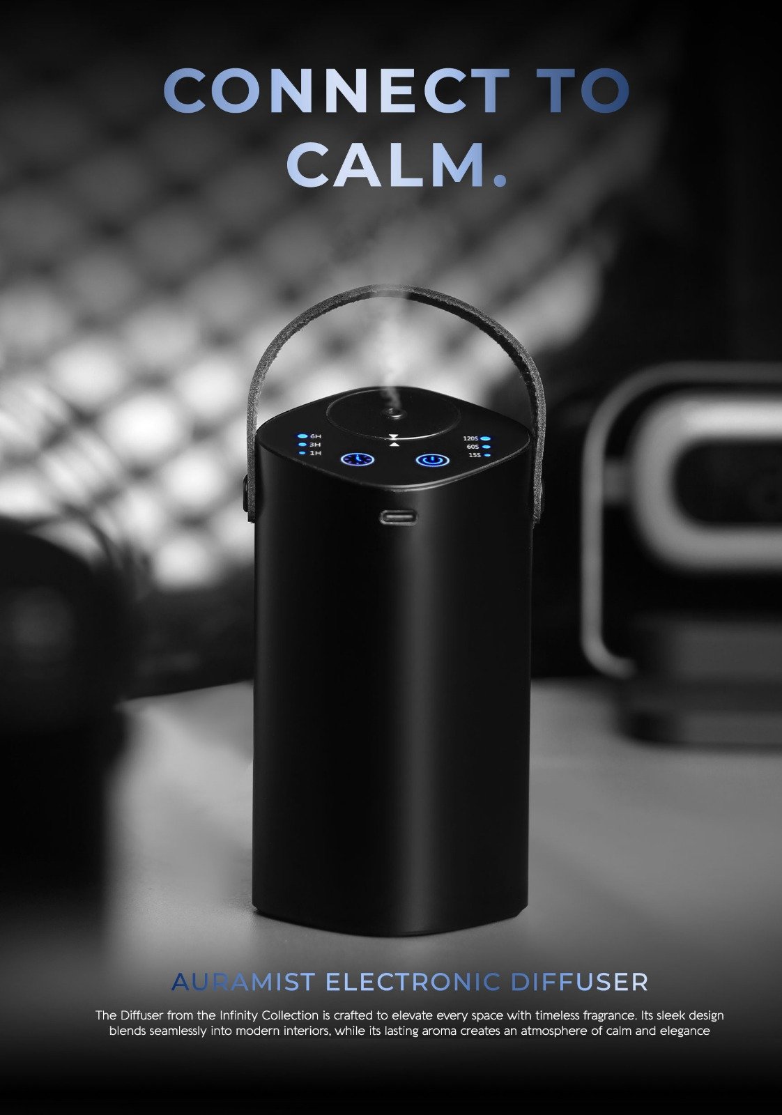 Add a touch of luxury to your home or office fragrance with the AURAMIST Portable Electronic Diffuser. Combining elegant design with advanced technology, it delivers a high-efficiency mist for perfectly balanced fragrance coverage. The smart touch screen allows easy control of operating time (1H / 3H / 6H) and mist intensity. With its powerful 2000mAh battery, enjoy long-lasting fragrance without the need for constant power, and recharge easily via USB. Perfect for home, office, car, shops, or as a premium gift.