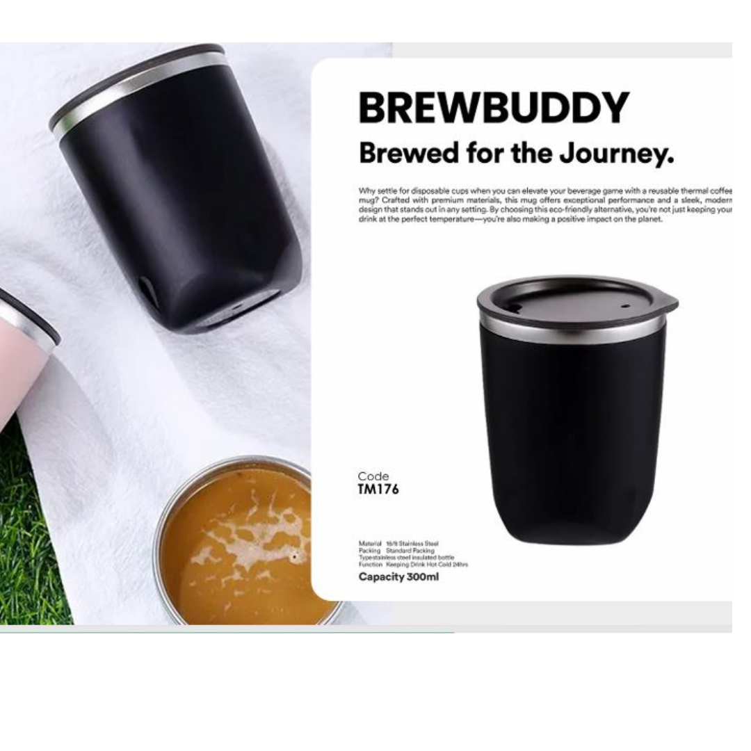 Say goodbye to disposable cups and elevate your beverage experience with the BREWBUDDY thermal mug. Crafted from premium stainless steel, this eco-friendly mug keeps your drinks at the perfect temperature for hours while reducing waste. With its modern, sleek design and durable build, it’s the perfect companion for home, office, travel, or outdoor adventures. Stylish, practical, and planet-friendly – BREWBUDDY is brewed for the journey.