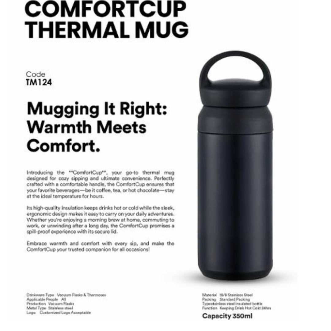 Mugging it right: warmth meets comfort with the ComfortCup Thermal Mug (Code TM124). Designed with an ergonomic handle and advanced insulation, this mug keeps your coffee, tea, or hot chocolate at the perfect temperature for hours. The spill-proof lid ensures a mess-free experience, while the modern and durable stainless steel design makes it ideal for everyday use. Whether at home, work, or on the go, ComfortCup is your perfect companion for cozy sipping anytime, anywhere.