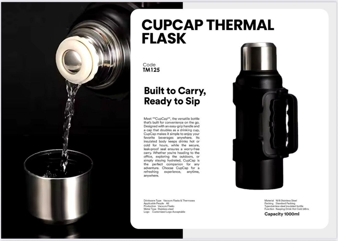 The CupCap Thermal Flask (Code TM125) is the ultimate hydration solution for everyday use. With a spacious 1000ml capacity, it’s perfect for work, travel, or outdoor adventures. Its innovative cap doubles as a drinking cup, while the sturdy handle makes it easy to carry anywhere. Thanks to advanced double-wall insulation and a leak-proof design, you can enjoy your hot or cold drinks worry-free all day long. Stay refreshed and prepared with CupCap – your trusted hydration partner.