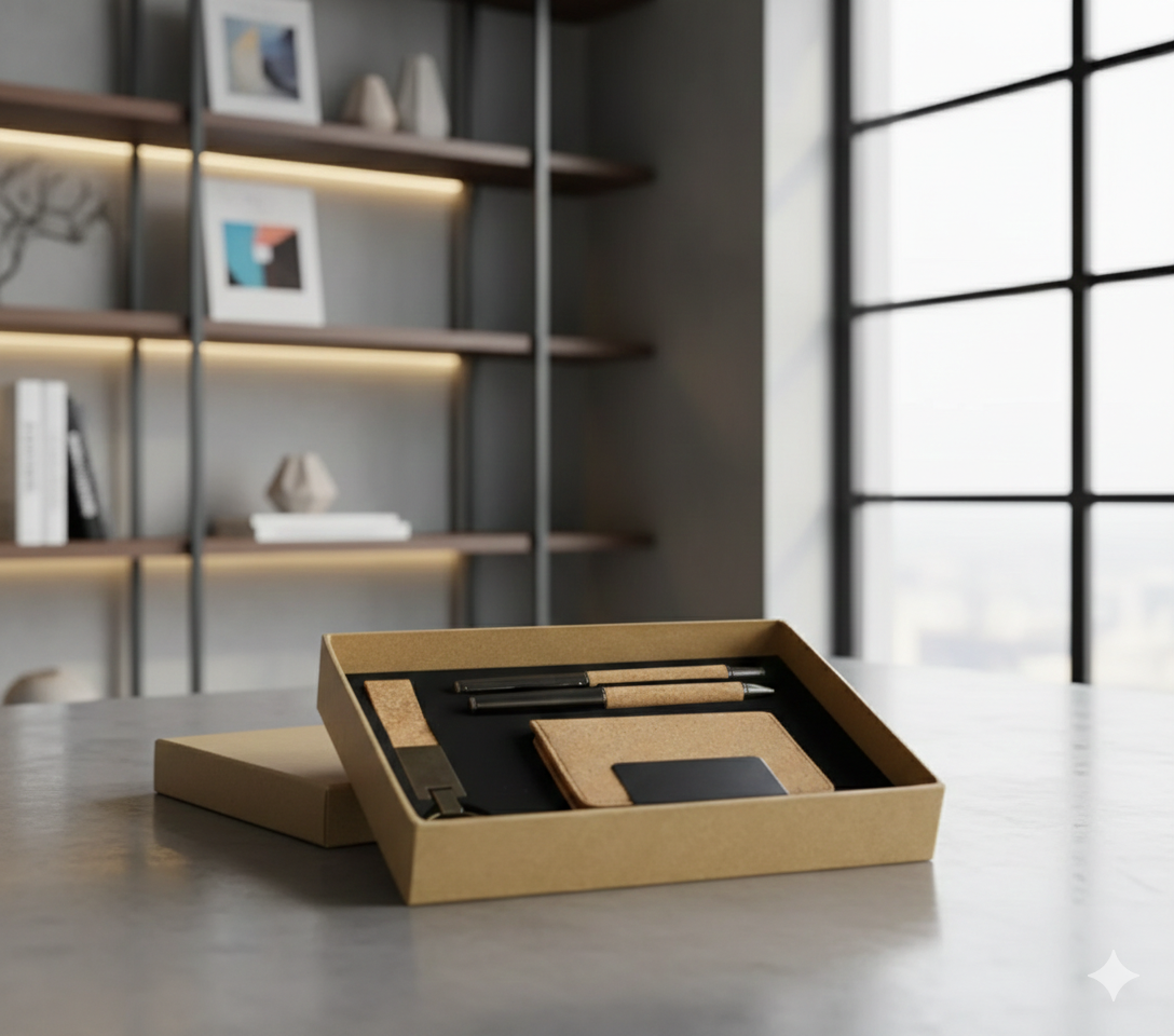 طقم هدايا بيئي أنيق: يتضمن حامل بطاقات من الفلين، وقلمًا معدنيًا أنيقًا، وميدالية مفاتيح جلدية، مصمم للمحترفين والمبدعين.