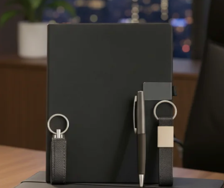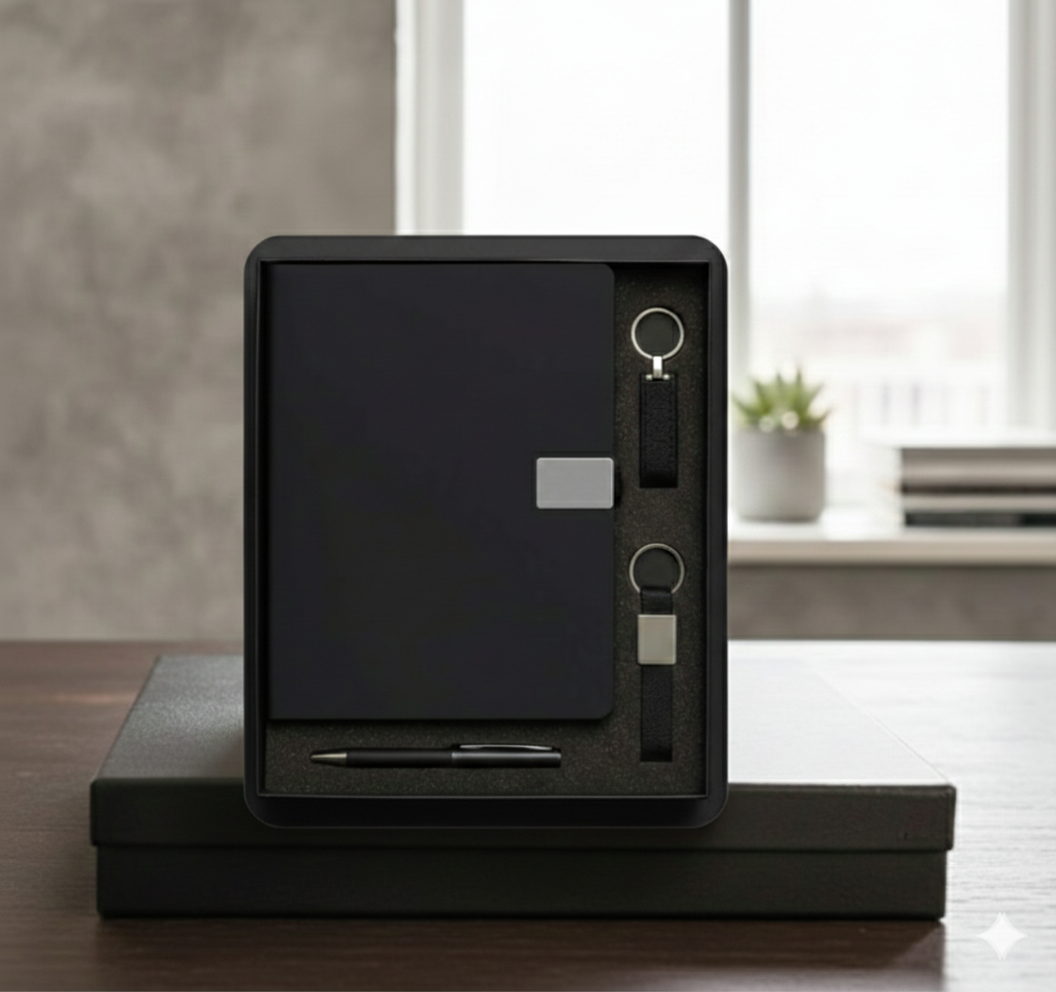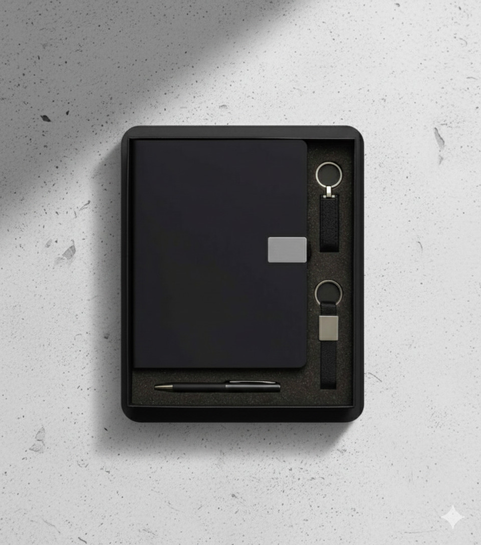 It includes a premium notebook, sleek metal pen, and two elegant keychains, all arranged neatly in a luxurious black executive box.