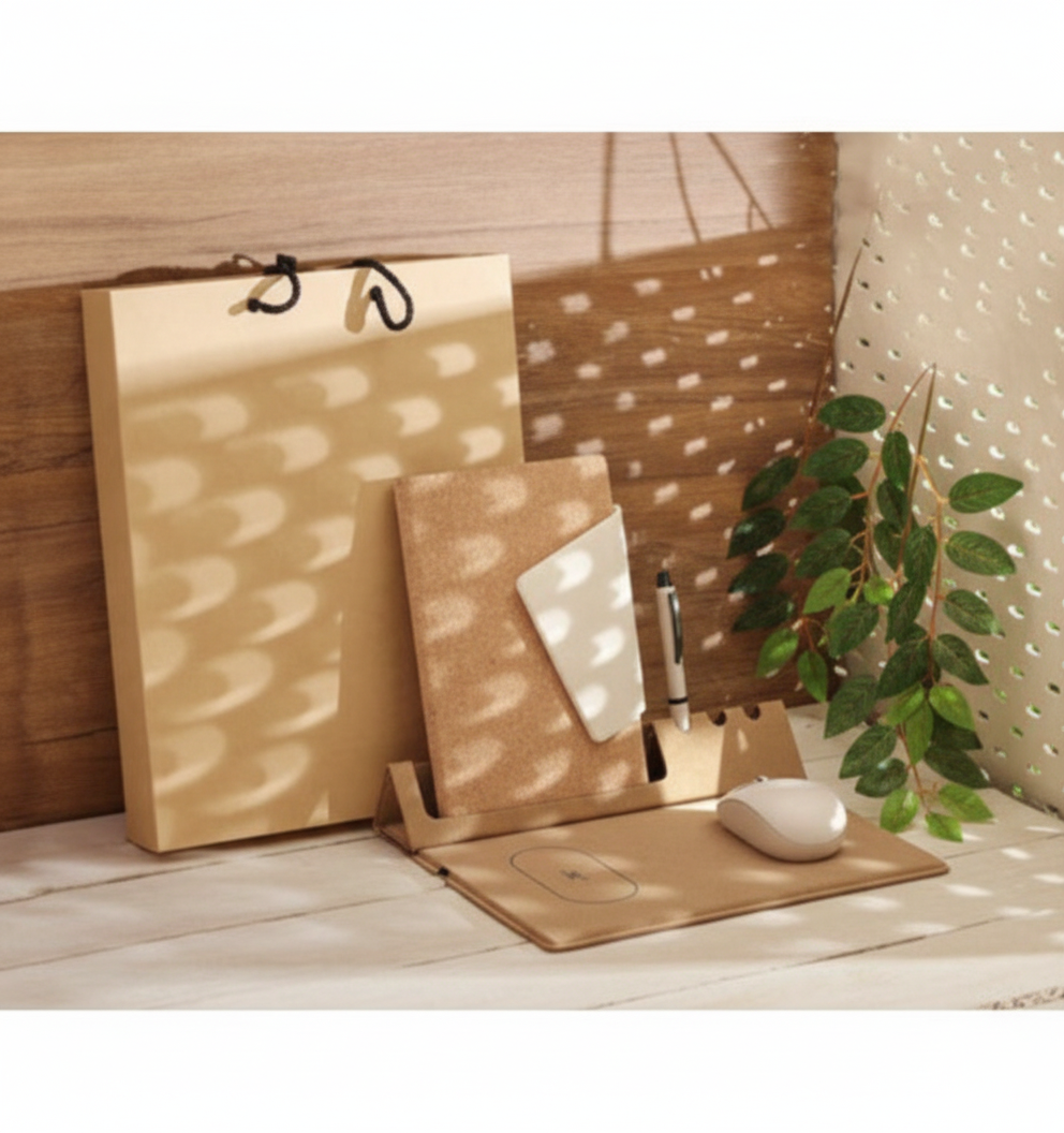 The cork-covered notebook and matching cork pen add a natural, premium touch while reinforcing the eco-friendly identity of the set. A wireless mouse in a soft beige tone complements the overall design, creating a cohesive and modern desk setup.