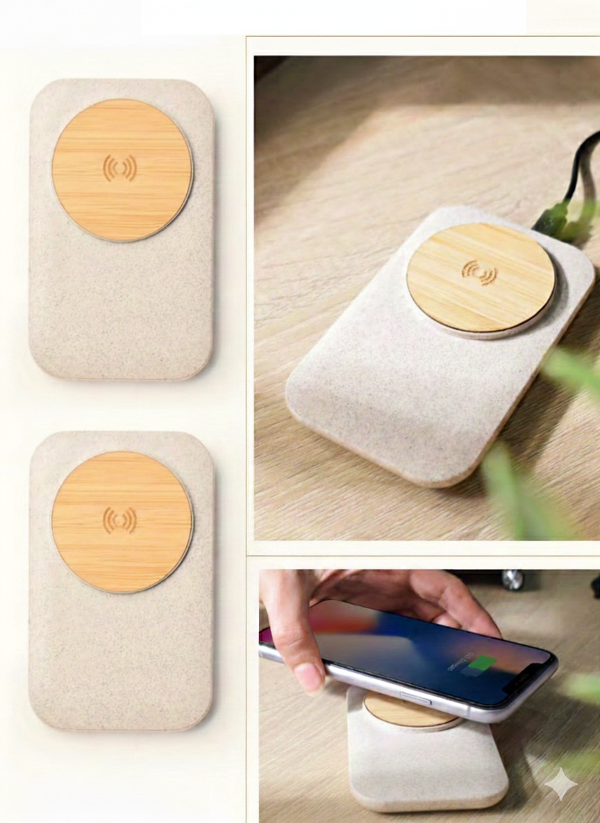 The bamboo top adds a warm, natural touch, while the wheat straw base enhances durability and eco-conscious appeal. Designed to support Qi-enabled smartphones, this charger provides reliable and convenient wireless charging for daily use.