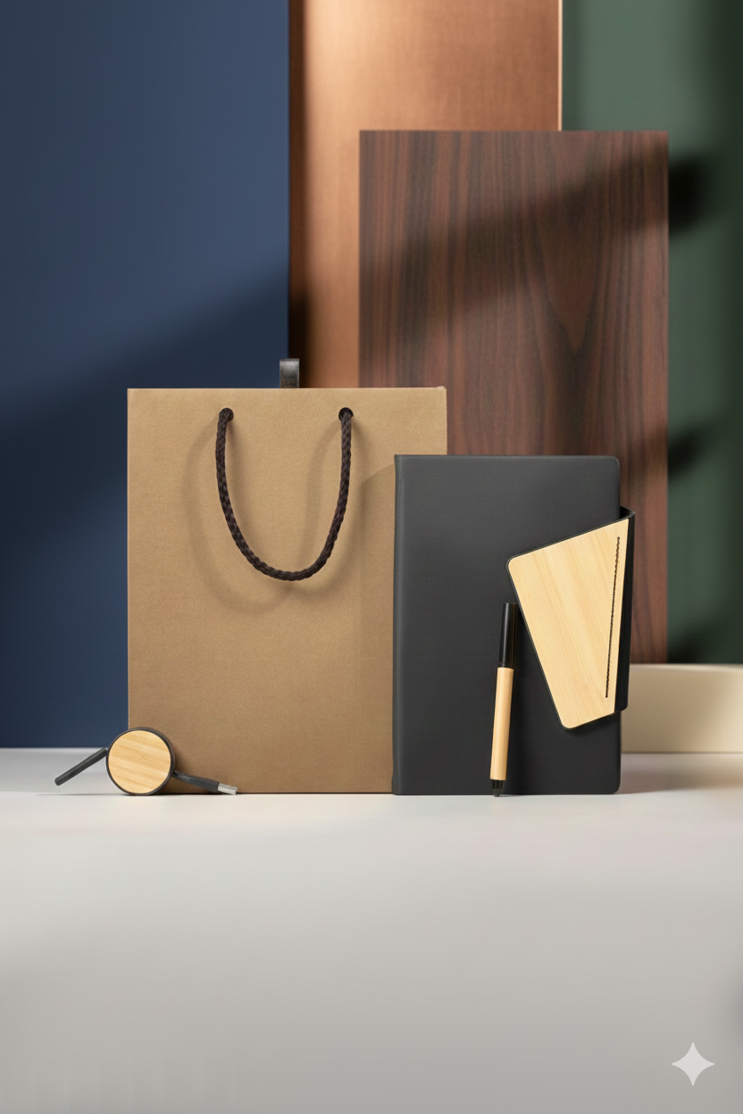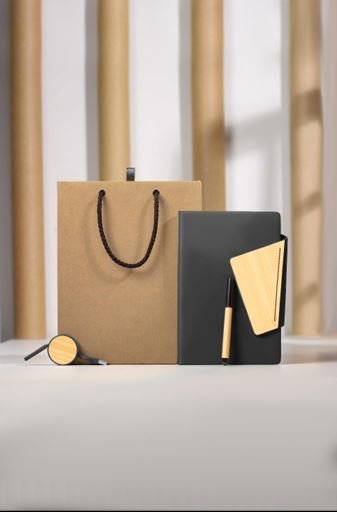 Discover the perfect gift set that combines elegance with practical functionality. The set features a luxury gift bag made from natural kraft paper, and a selection of distinctive notebooks, such as the Cork Notebook with a front pocket for cards or notes. Some notebooks include a wooden piece with wrapped cables for convenient multi-charging. Ideal for personal gifts, office use, or any occasion requiring a luxurious and eco-friendly touch.