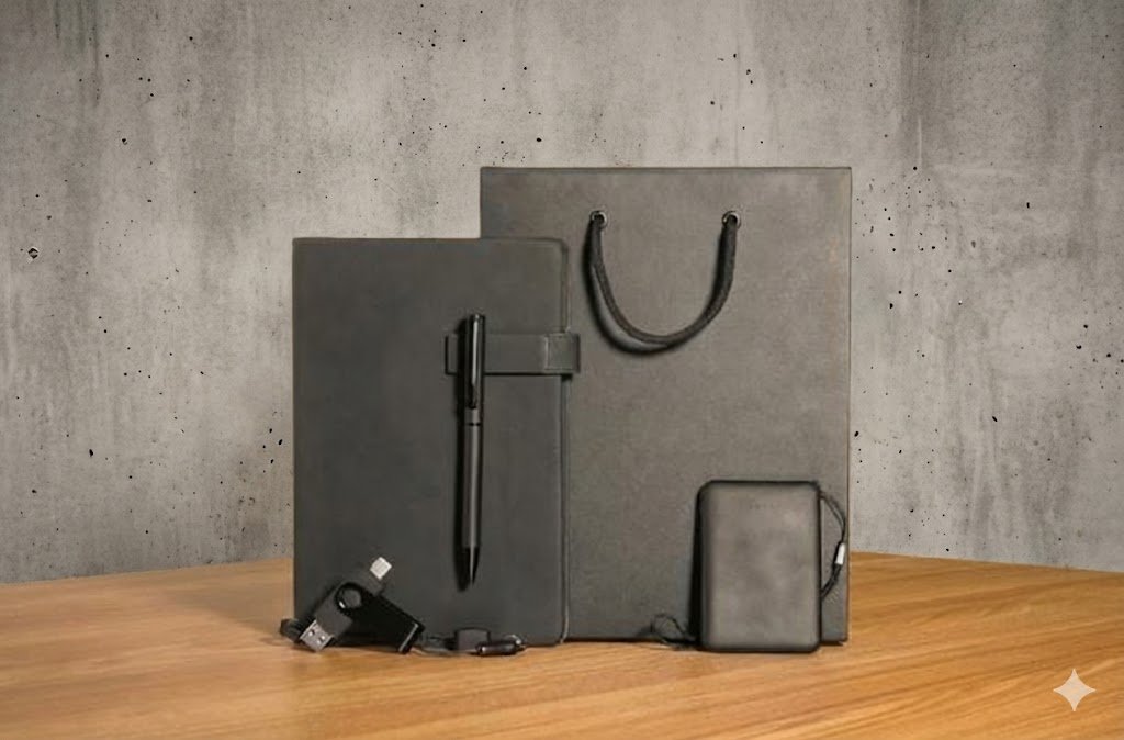 Elevate your professional gifting experience with this premium black executive set. Designed with modern aesthetics and practical functionality, this set includes a refined notebook, a smooth-writing pen, a compact power bank for on-the-go charging, and a versatile multi-port USB drive—beautifully presented in a stylish matte gift bag.