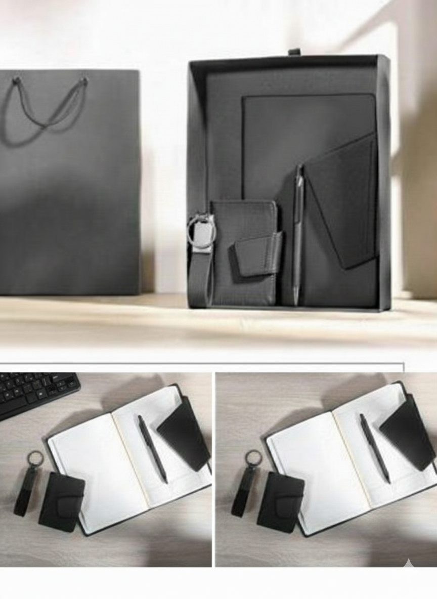 This premium bundle includes a high-quality notebook, a smooth-writing pen, a sturdy keychain, and a practical card holder — all presented inside an elegant gift bag.