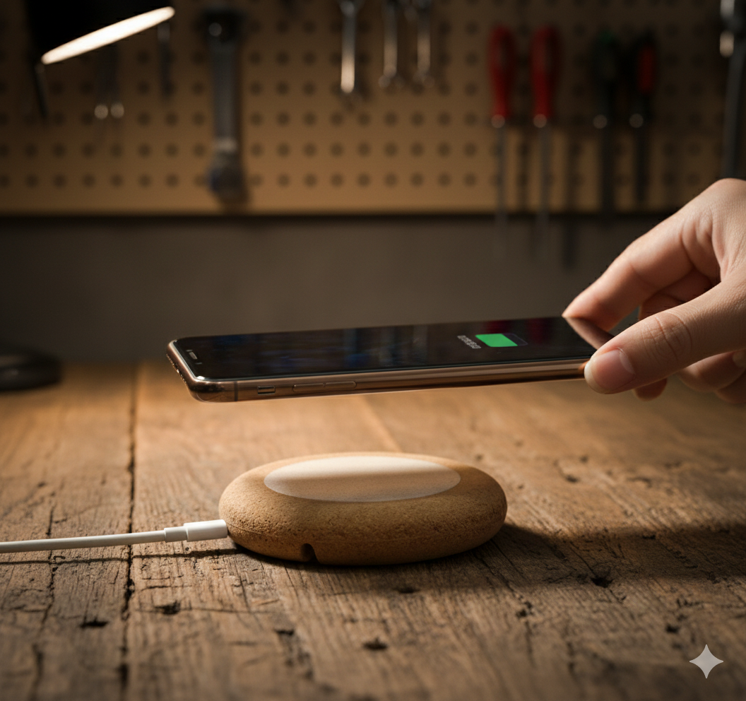 The Wheat & Cork Wireless Charger combines sustainable materials with modern wireless charging technology to deliver an elegant and eco-conscious power solution. Crafted from a unique blend of wheat straw bio-plastic and natural cork, this charger reflects a commitment to sustainability without compromising performance.