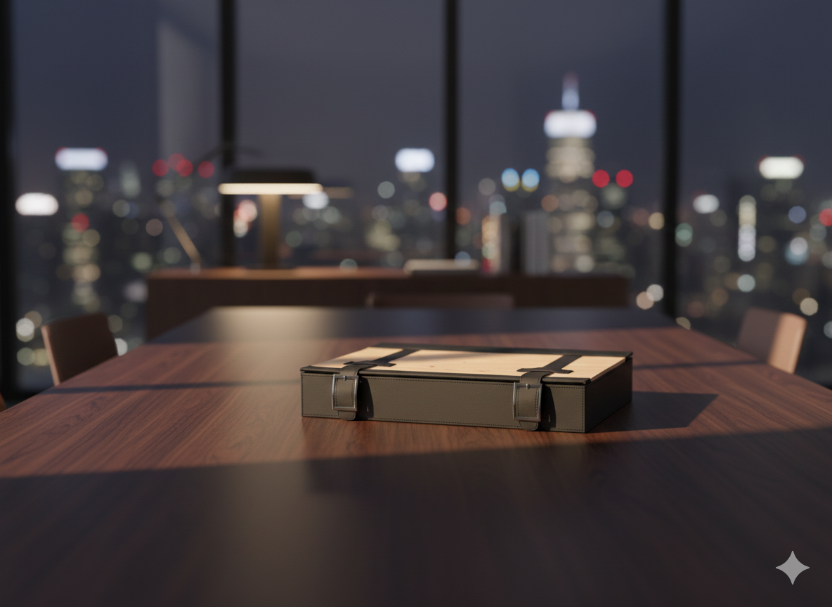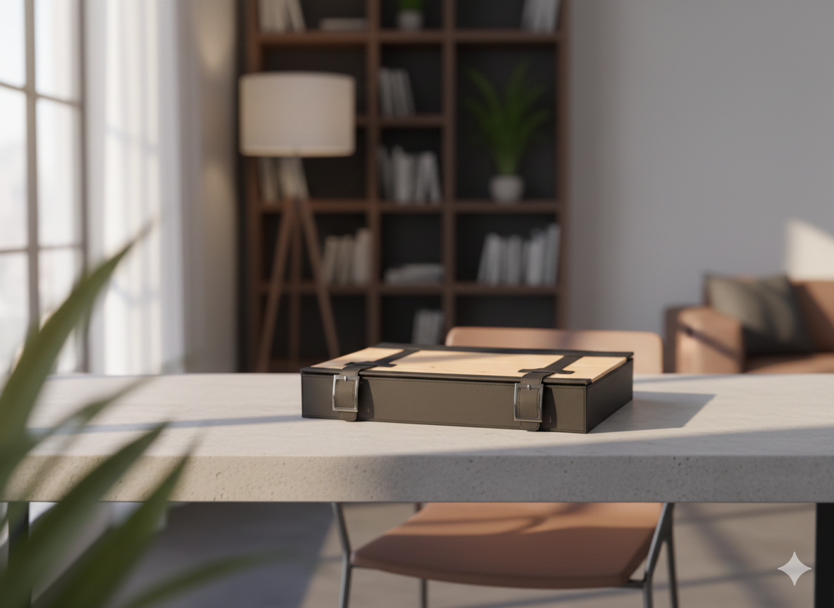Made from eco-friendly wood combined with a durable black rubber finish, the box creates a unique contrast between natural and contemporary materials. The foldable-style design adds flexibility, while the leather handles and secure closure enhance both elegance and practicality.