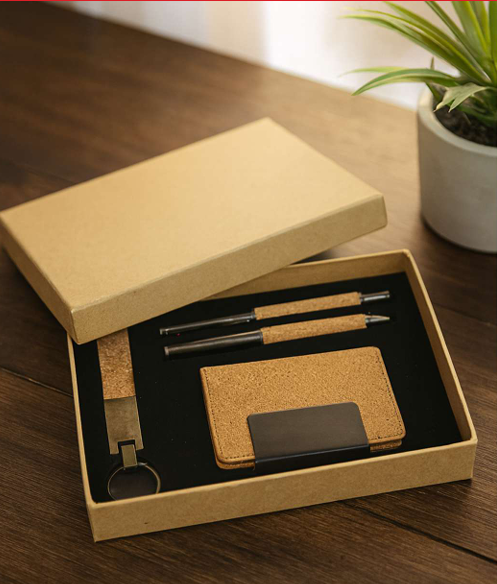 Elegant Eco Gift Set: Includes a cork card holder, sleek metal pen, and leather keychain, designed for professionals and creatives.