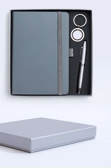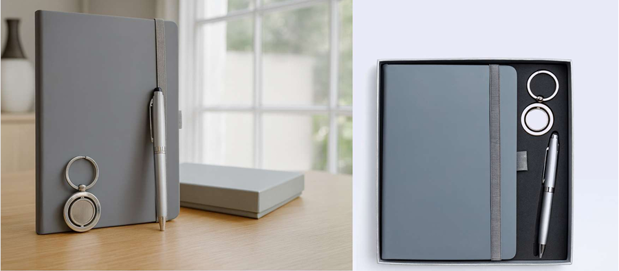 3-Piece Executive Gift Set: Includes a premium grey A5 notebook, elegant pen, and stylish metallic keychain.