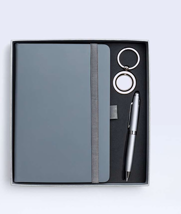 Premium 3-in-1 Business Gift Set with Grey Notebook, Pen & Keychain – Elegant A5 Size| Code: CON-Med-Col-08