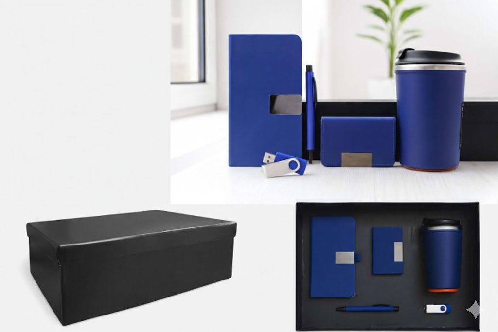 Premium 5-in-1 Business Gift Set – Thermal Mug, Metal Pen, Flash Drive, Card Holder & Notebook – Dark Blue Luxury Gift Box|Code : CON-Blue set-12