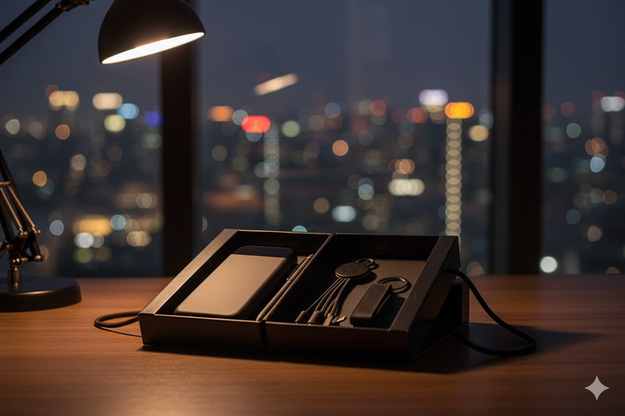 Premium business gift set with power bank, 3-in-1 charging cable, pen, and keychain