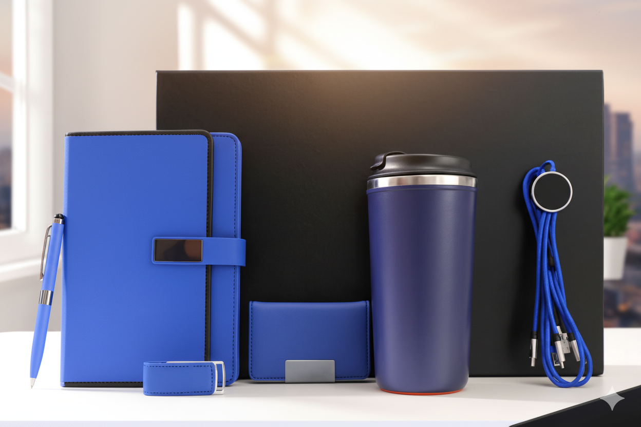 Executive Business Gift Set with Notebook, Thermal Mug, Flash Drive, Metal Pen, Card Holder & Charging Cable – Navy Blue| Code:CON-Business-Blue-1